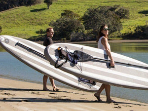 Custom made, hard wearing (PVC) anti skid fabric replaces the widely used EVA foam allowing for a superior fabric to fabric bonding system to be used. We also bond this hard wearing PVC to the sides of the SUP for added protection when along side boats, paddling through wharfs, or in transit.